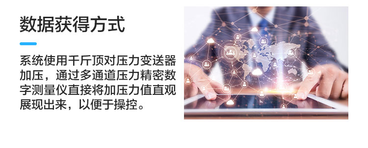 數據獲得方式:系統使用千斤頂對壓力變送器加壓,通過多通道壓力精密數字測量儀直接將加壓力值直觀展現出來,以便于操控。